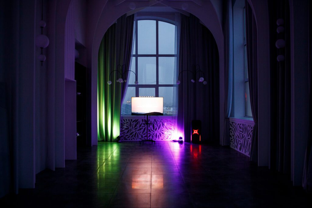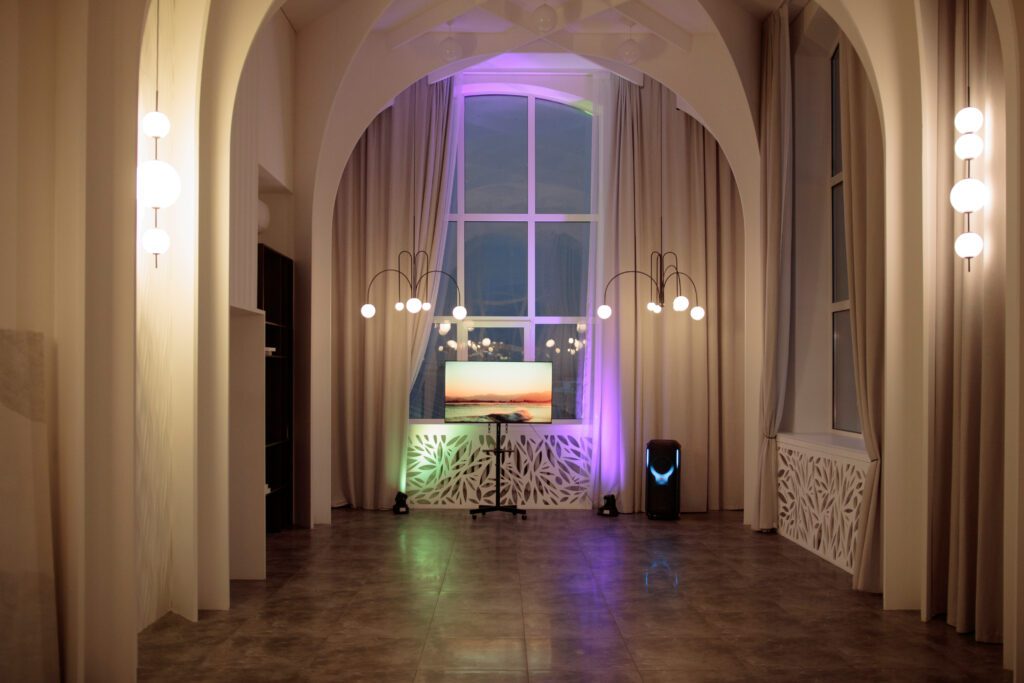 С арендой зала бесплатно предоставляется колонка JBL Partybox 710 (800 Вт) с возможностью проводного подключения или Bluetooth, сценический свет Bi Ray ML70S (3 шт.), ТВ на подставке для трансляции видео контента, караоке на 2 беспроводных микрофона.